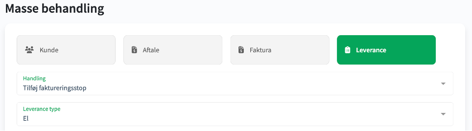 Når du foretager en massebehandling på leveranceniveau, skal du – udover Handling (gennemgås nedenfor) – vælge hvilken leverancetype, handlingen skal foretages på (fx el eller abonnement v2).