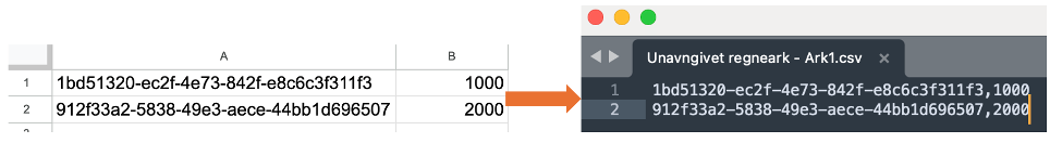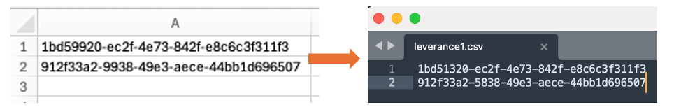 Når du har valgt hvilken handling, der skal foretages, danner du en CSV-fil (kommasepareret, ikke semikolonsepareret), der indeholder external_id på de leverancer, der skal opdateres.