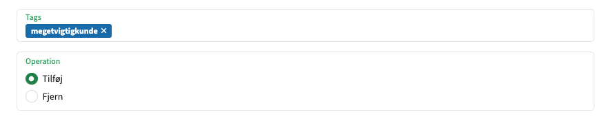 Vær opmærksom på, at du skal trykke ”tab”, når du har angivet et tag => så bliver tagget blåt, og kan tilføjes/fjernes. Bemærk også, at CUBS har en øvre grænse på 255 karakterer for, hvor mange tags, der kan tilføjes til en entitet. Hvis du mener at have brug for flere tags/karakterer, så kontakt os, og lad os tage en snak om, hvorfor behovet for tags opstår.