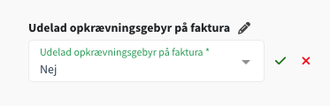Alle aftaler vil som udgangspunkt blive tjekket for, om der skal pålægges et gebyr. Hvis enkelte aftaler skal undtages fra opkrævningsgebyrer, er det muligt at markere dette på aftalen ved at sætte “Udelad opkrævningsgebyr på faktura” til “Ja” (den vil som standard være sat til “Nej” på alle aftaler).