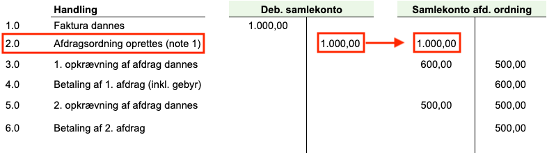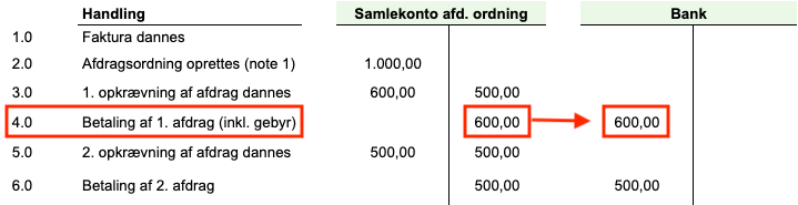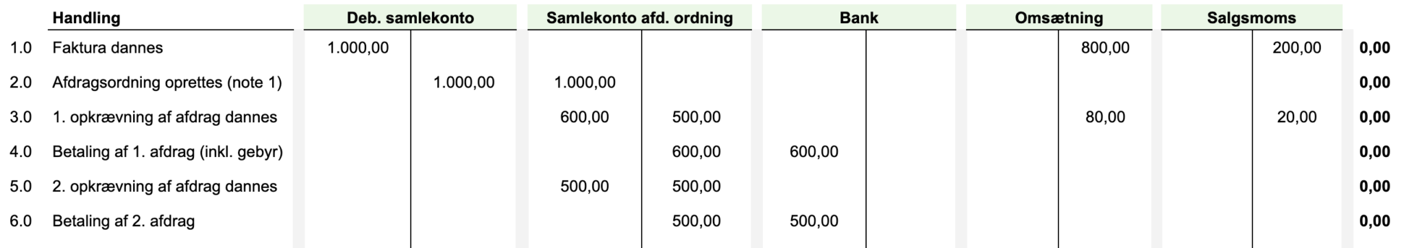 Når betalingen kommer på det første afdrag, bliver den krediteret på samlekontoen for afdragsordningen, og debiteret på banken. Når et eventuelt andet afdrag opkræves, bliver beløbet igen debiteret på afdragsordningen, og herefter krediteret på samme bogføringskonto.